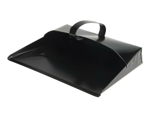 A sturdy metal dustpan with a hooded design that is ideal for collecting dust and helps retain dirt and debris until ready to be emptied.