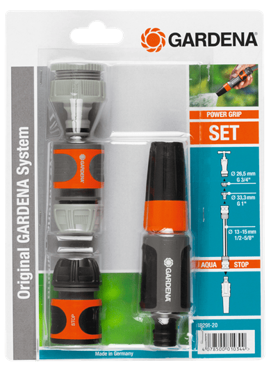 The GARDENA Basic Set supports your cleaning and watering around the house and in the garden. The starter set with cleaning nozzle, tap connector, adapter, hose connector and water stop ensures a secure garden hose connection to the tap. All parts deliver long-lasting use due to high-quality manufacture. The discreet but elegant design gives the Basic Set a look that is as stylish as it is timeless, perfectly suiting your garden or your terrace. The 2-in-1 spray jet on the nozzle provides the optimal water jet for different situations – whether the spray jet for cleaning work or the softer mist spray for irrigation, the water spray is smoothly adjustable. The water stop in the set allows you to change the attachment from a sprayer to a spray lance or sprinkler, without going to the water tap. The water stops automatically when the sprayer is removed and starts again as soon as the new attachment is connected. The GARDENA Full Set is compatible with 1/2″ – 5/8″ (13-15 mm) hoses, as well as suitable for water taps with 26.5 mm (G 3/4″) and 33.3 mm (G 1″) threads. The Basic Set is UV and frost resistant and can therefore be left outside all year round. It is made in Germany and is backed by a five-year manufacturer’s warranty from GARDENA. Das Original GARDENA System.