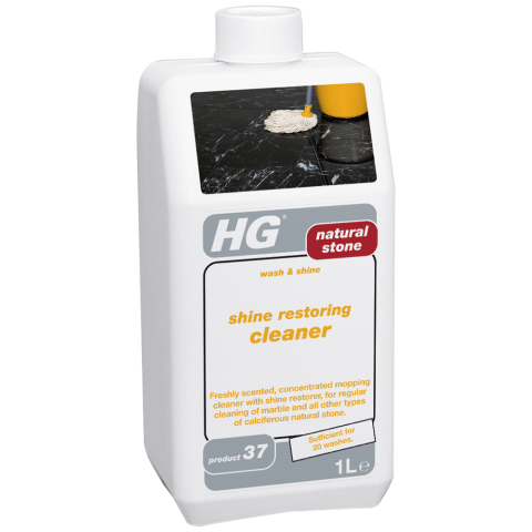HG shine restoring cleaner (product 37) is a freshly scented, concentrated mopping cleaner. This shine restorer was developed for regular cleaning of marble and all other types of calciferous natural stone. Cleaning the natural stone floor with this mopping cleaner also restores shine.