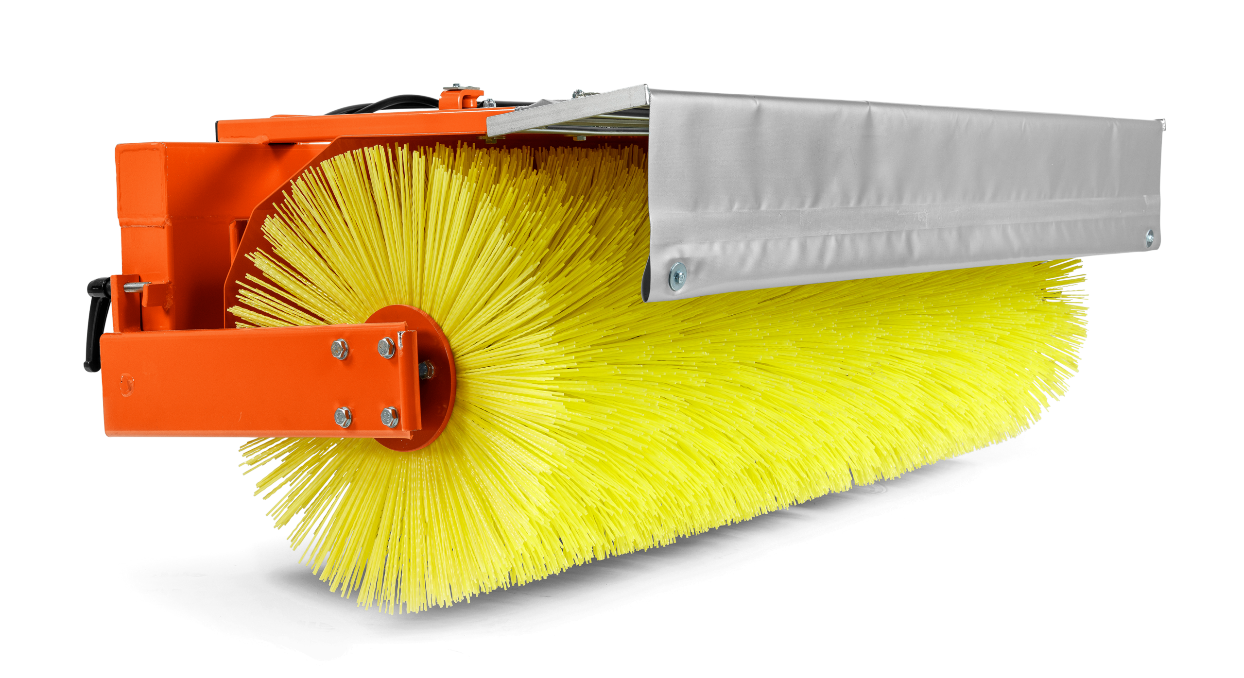 The broom is a front-mounted attachment driven by a PTO shaft and requires a hydraulic supply plus a counterweight kit on the carrier vehicle. Check your vehicle’s front linkage and hydraulic compatibility with your dealer before purchase.