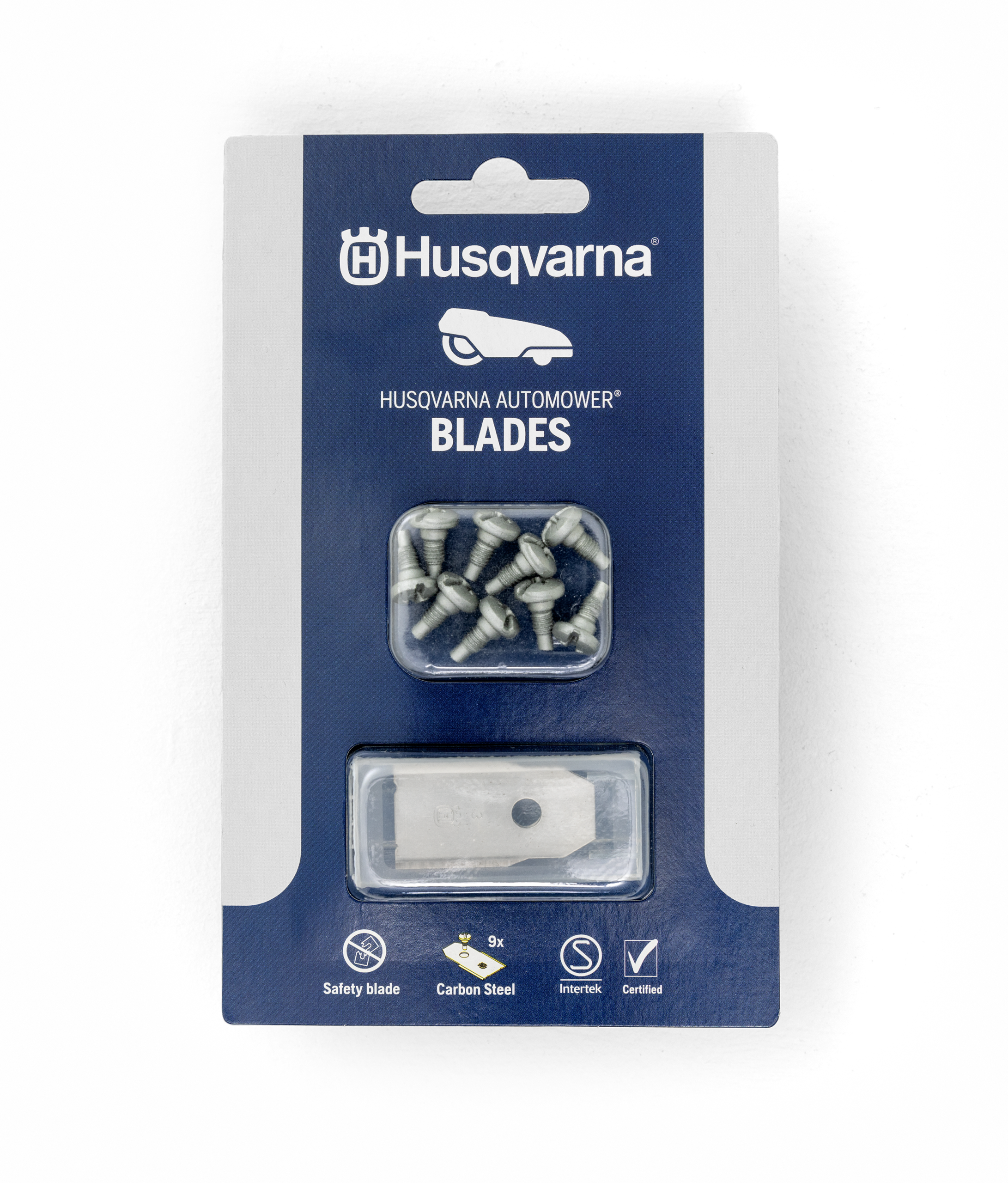 Replacement set of nine hardened carbon steel blades designed for Husqvarna robotic mowers. The Classic Blades fold back on impact for added safety and provide two cutting edges for a clean cut. Keep blades sharp and intact to maintain lawn health and mower performance.