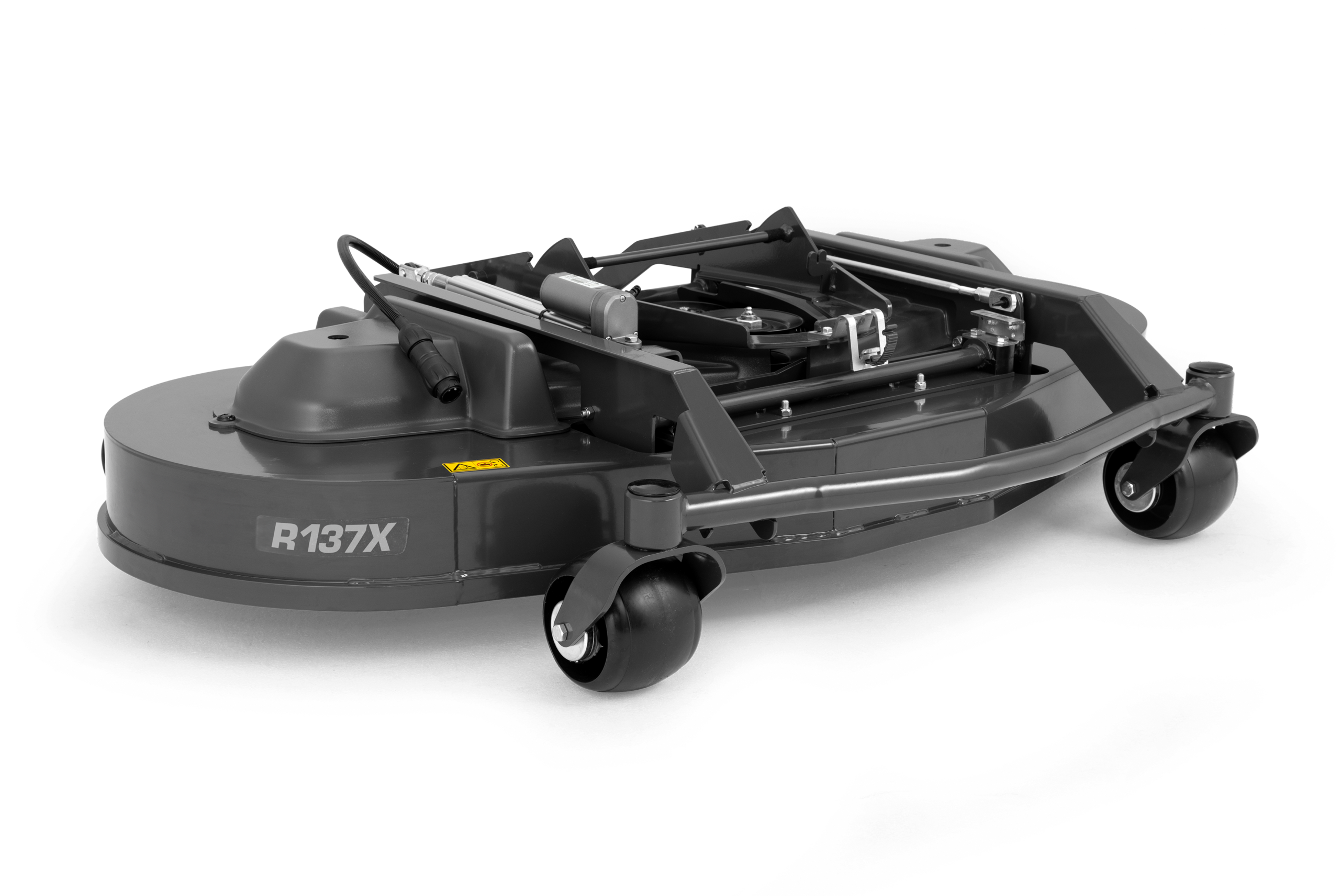 Fabricated 137 cm (54″) rear-discharge cutting deck designed for productive mowing of heavier grass. The R137X is a steel, powder-coated deck with three blades and anti-scalp wheels. The product description states the cutting height can be adjusted electrically from the driver’s seat; note that the front mower must be fitted with the ‘Power outlet kit, Front’ for that function to operate.