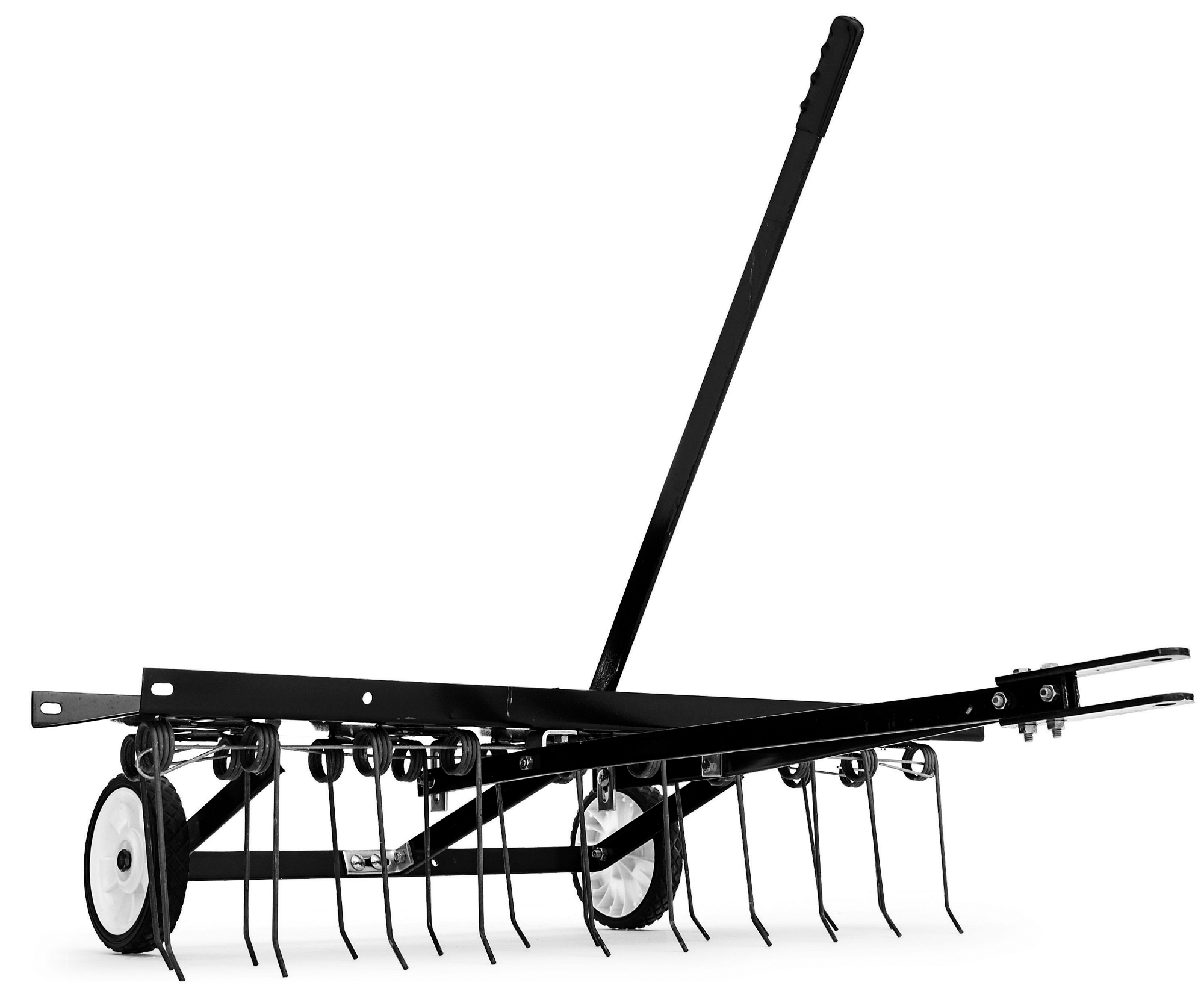 Ten plugs/spikes agitate and lift moss effectively across a 102 cm working width, reducing the number of passes required compared with smaller hand rakes.