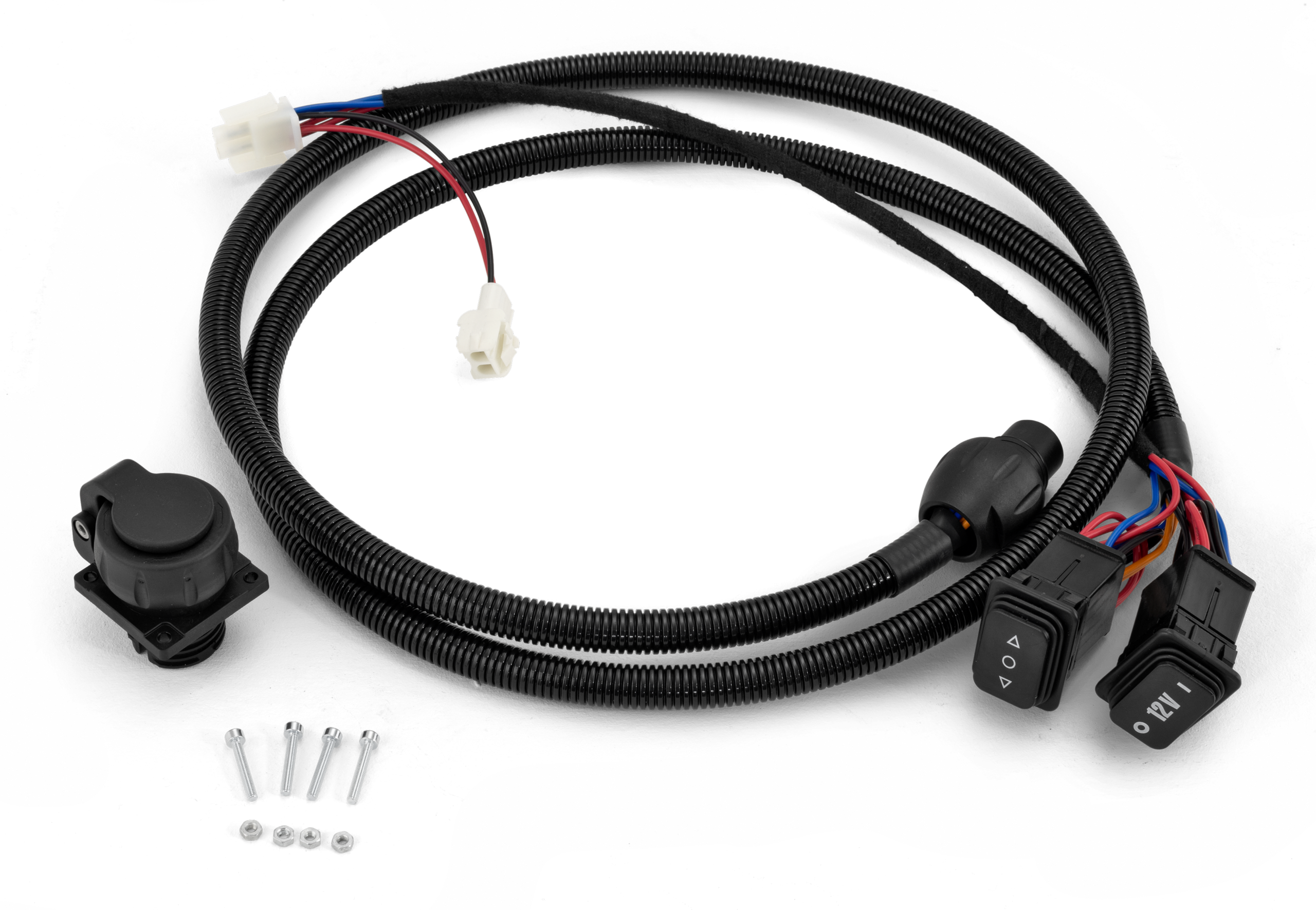 Kit containing a female connector, cables and switches to supply electricity to rear-mounted attachments. Controls all rear attachments that require power and is designed for a one-time installation. As an installer I recommend confirming vehicle compatibility and routing options before fitting to ensure a tidy, secure installation.